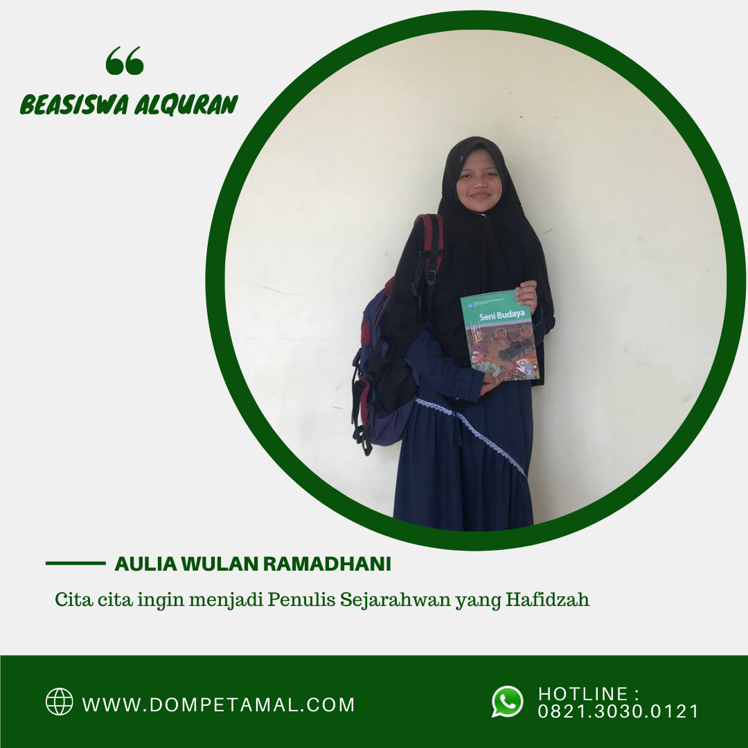 Aulia Wulan Ramadhani adalah santri di Pondok Pesantren Tasdiqul Qur’an, ia berasal dari Cimahi, ayahnya bekerja sebagai Driver Online dan ibunya sebagai ibu rumah tangga. Aulia adalah santri yang berprestasi ia mempunyai cita-cita ingin menjadi seorang hafidzah dan penulis sejarahwan