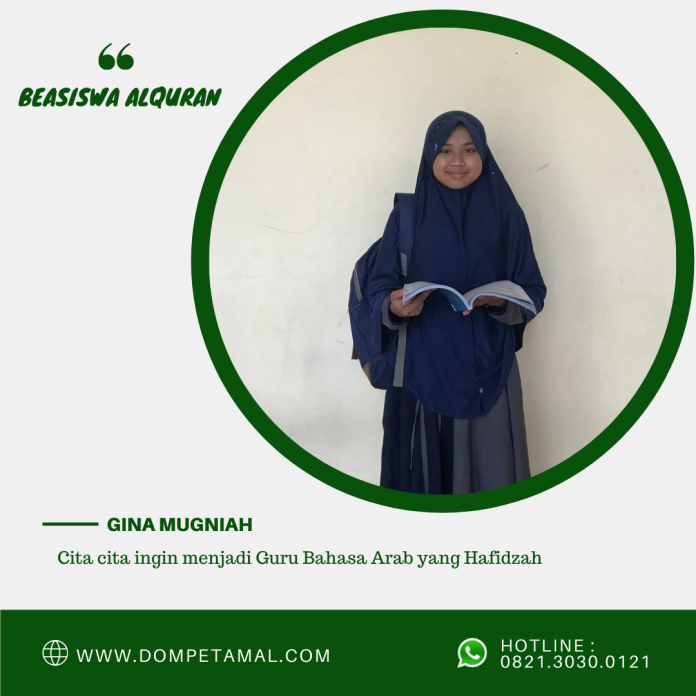 Gina Mugniah adalah santri di Pondok Pesantren Tasdiqul Qur’an yang berasal dari Desa Cililin, Bandung Barat.