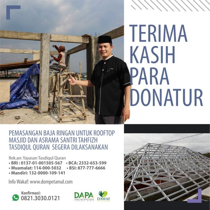 Pada akhir tahun 2022 ini, proses pembangunan masjid dan asrama santri tahfizh telah dilakukan pemasangan baja ringan untuk atap (rooftop) bangunan.